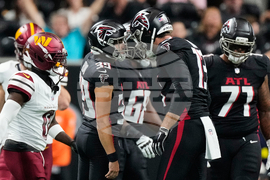 Atlanta Falcons safety Xavier Watts, left, celebrates his interception against the Washington Commanders during the second half of an NFL football game, Sunday, Sept. 28, 2025, in Atlanta. (AP Photo/Brynn Anderson)