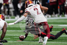 Atlanta Falcons quarterback Michael Penix Jr., below, recovers a fumble during the first half of an NFL football game against the Washington Commanders, Sunday, Sept. 28, 2025, in Atlanta. (AP Photo/Mike Stewart)