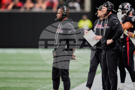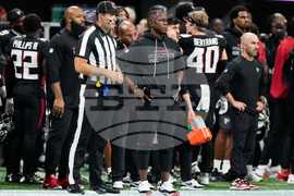 Atlanta Falcons head coach Raheem Morris, left, talks to people on the sideline before an NFL football game against the Washington Commanders, Sunday, Sept. 28, 2025, in Atlanta. (AP Photo/Brynn Anderson)
