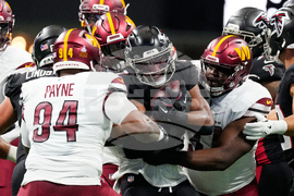 Washington Commanders quarterback Marcus Mariota, right, is sacked by Atlanta Falcons defensive end Zach Harrison (96) during the first half of an NFL football game, Sunday, Sept. 28, 2025, in Atlanta. (AP Photo/Brynn Anderson)