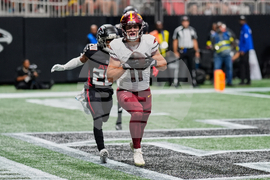 Atlanta Falcons tight end Kyle Pitts (8) scores a touchdown past Washington Commanders safety Darnell Savage (25) during the second half of an NFL football game, Sunday, Sept. 28, 2025, in Atlanta. (AP Photo/Mike Stewart)