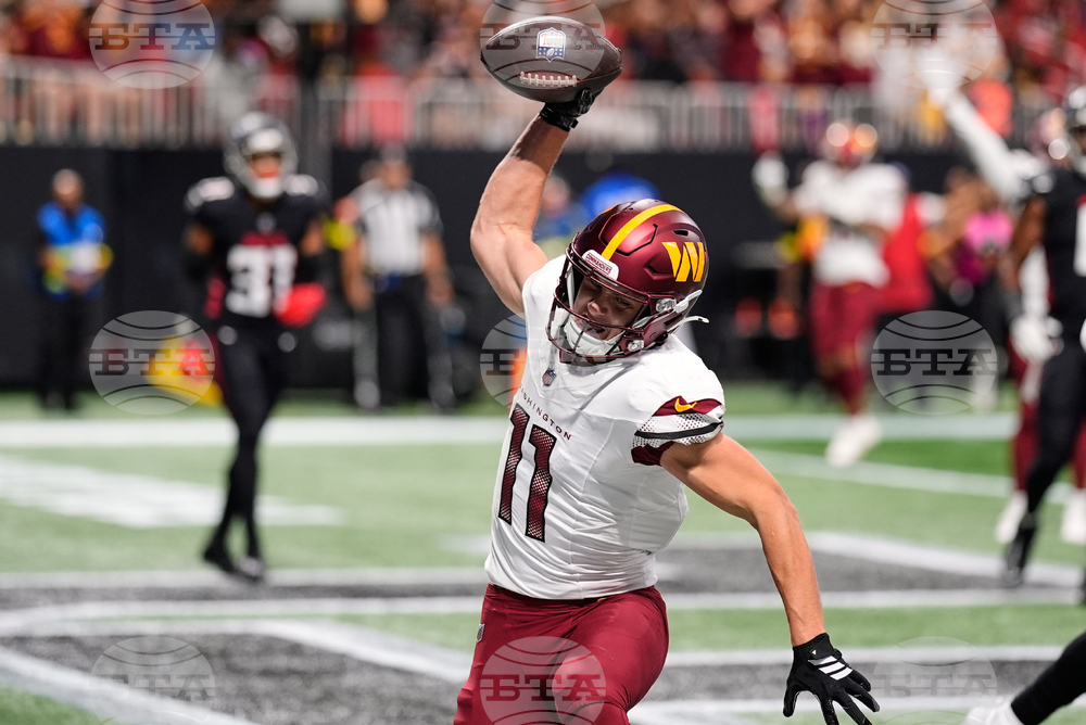Washington Commanders wide receiver Luke McCaffrey (11) spikes the ball to celebrate his touchdown against the Atlanta Falcons during the first half of an NFL football game, Sunday, Sept. 28, 2025, in Atlanta. (AP Photo/Mike Stewart)
