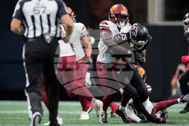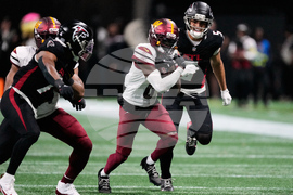 Atlanta Falcons quarterback Michael Penix Jr., right, is sacked by Washington Commanders linebacker Frankie Luvu, below, during the first half of an NFL football game, Sunday, Sept. 28, 2025, in Atlanta. (AP Photo/Brynn Anderson)