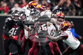 Atlanta Falcons running back Bijan Robinson, center, is tackled by a host of Washington Commanders defenders during the first half of an NFL football game, Sunday, Sept. 28, 2025, in Atlanta. (AP Photo/Brynn Anderson)