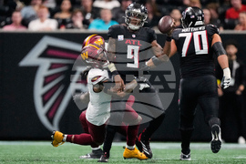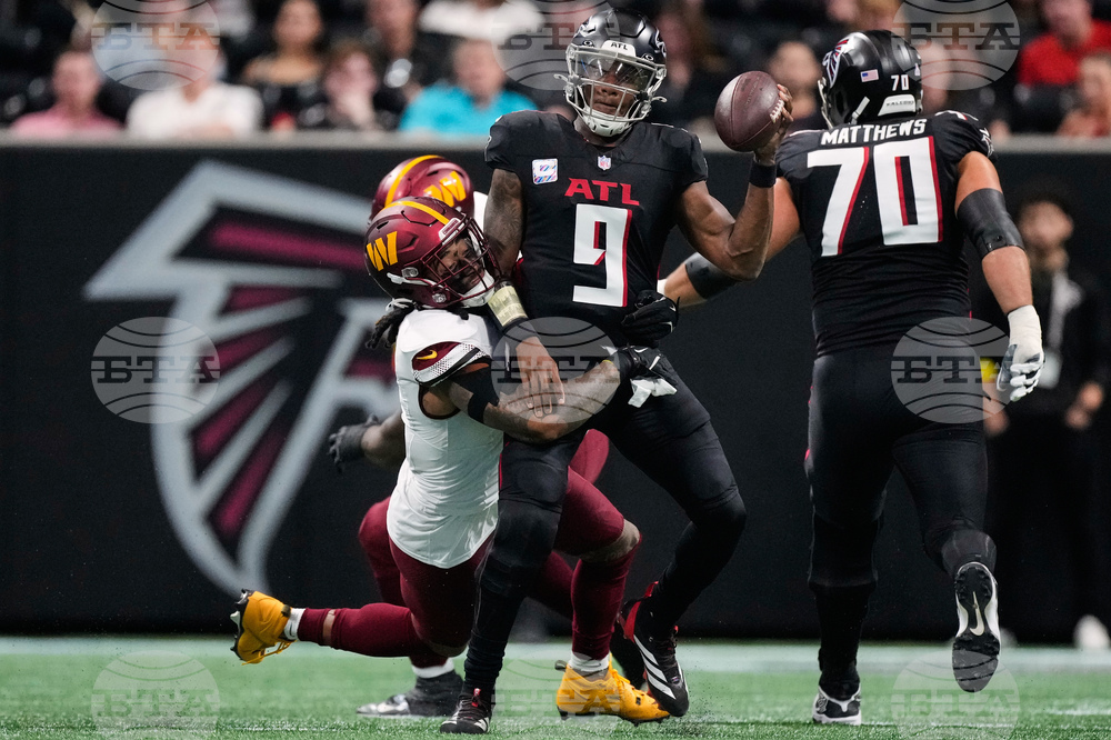 Atlanta Falcons quarterback Michael Penix Jr. (9) is sacked by Washington Commanders linebacker Frankie Luvu, left, during the first half of an NFL football game, Sunday, Sept. 28, 2025, in Atlanta. (AP Photo/Brynn Anderson)