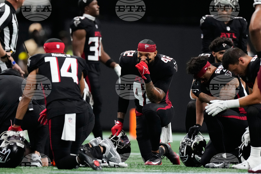 Atlanta Falcons players kneel on the field as cornerback Natrone Brooks is tended to by trainers after an injury during the first half of an NFL football game against the Washington Commanders, Sunday, Sept. 28, 2025, in Atlanta. (AP Photo/Brynn Anderson)