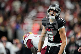 Atlanta Falcons running back Tyler Allgeier celebrates his touchdown against the Washington Commanders during the second half of an NFL football game, Sunday, Sept. 28, 2025, in Atlanta. (AP Photo/Brynn Anderson)