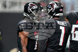 Atlanta Falcons running back Bijan Robinson (7) celebrates with wide receiver Drake London (5) after a long run against the Washington Commanders during the second half of an NFL football game, Sunday, Sept. 28, 2025, in Atlanta. (AP Photo/Brynn Anderson)