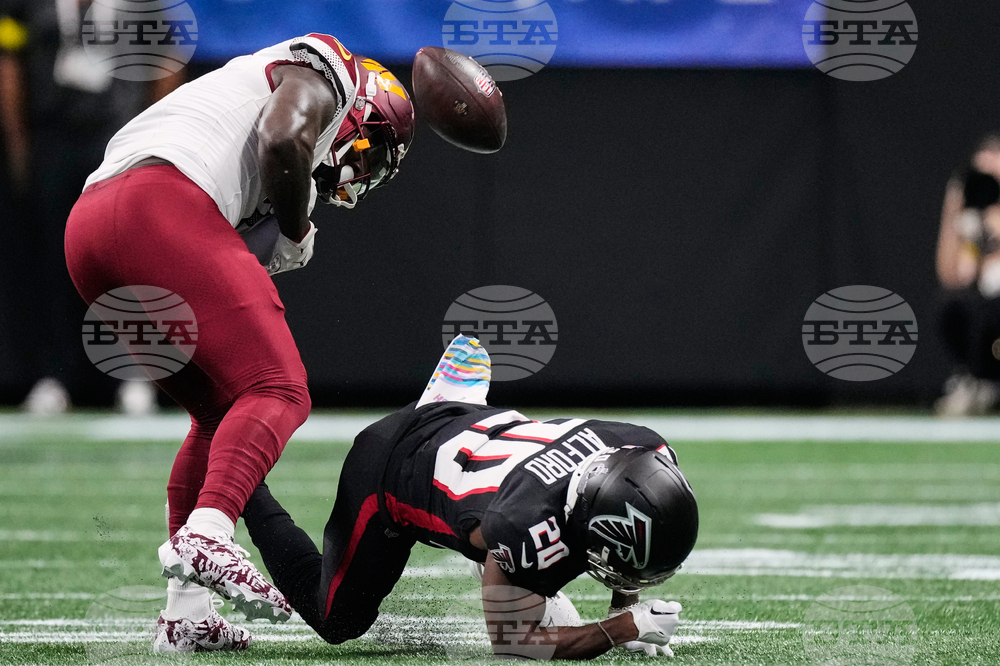 Atlanta Falcons cornerback Dee Alford (20) forces Washington Commanders wide receiver Deebo Samuel Sr., left, to fumble the ball during the first half of an NFL football game, Sunday, Sept. 28, 2025, in Atlanta. (AP Photo/Brynn Anderson)