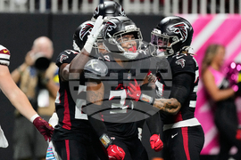 Atlanta Falcons tight end Kyle Pitts (8) celebrates his touchdown against the Washington Commanders with running back Bijan Robinson, center, during the second half of an NFL football game, Sunday, Sept. 28, 2025, in Atlanta. (AP Photo/Mike Stewart)