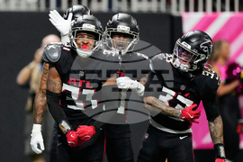 Atlanta Falcons safety Xavier Watts, center, celebrates his interception against the Washington Commanders during the second half of an NFL football game, Sunday, Sept. 28, 2025, in Atlanta. (AP Photo/Brynn Anderson)