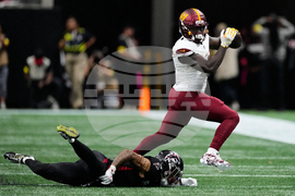 Atlanta Falcons wide receiver Drake London, center, runs the ball past Washington Commanders cornerback Trey Amos (23) during the first half of an NFL football game, Sunday, Sept. 28, 2025, in Atlanta. (AP Photo/Mike Stewart)