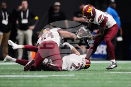 Atlanta Falcons running back Bijan Robinson, center, is tackled by Washington Commanders middle linebacker Bobby Wagner (54) and cornerback Marshon Lattimore (2) during the second half of an NFL football game, Sunday, Sept. 28, 2025, in Atlanta. (AP Photo/Brynn Anderson)