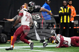 Atlanta Falcons running back Tyler Allgeier (25) scores a touchdown past Washington Commanders safeties Quan Martin (20) and Jeremy Reaves (39) during the second half of an NFL football game, Sunday, Sept. 28, 2025, in Atlanta. (AP Photo/Mike Stewart)