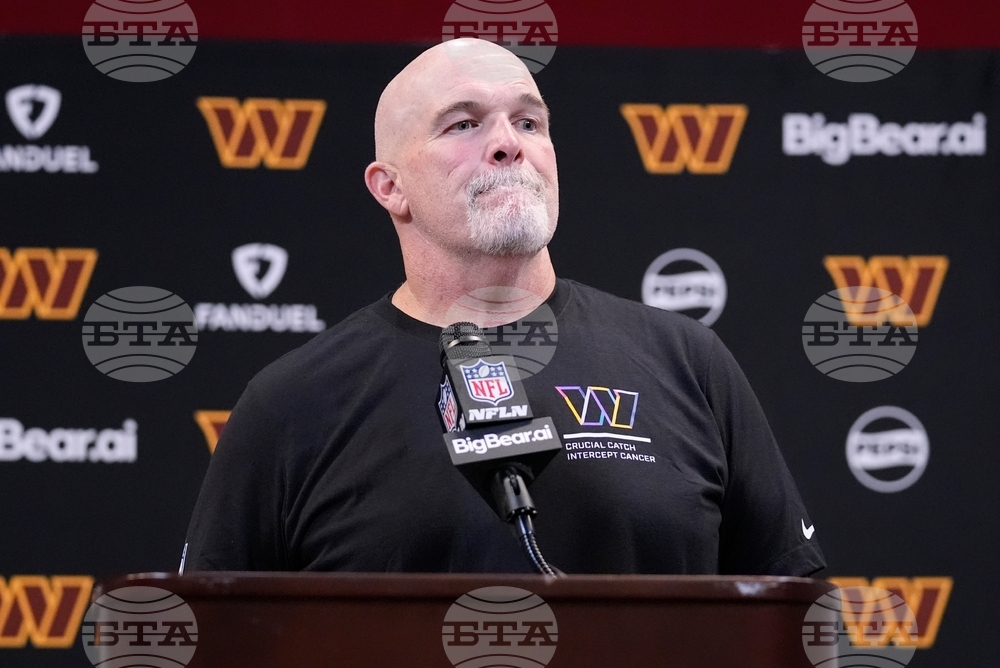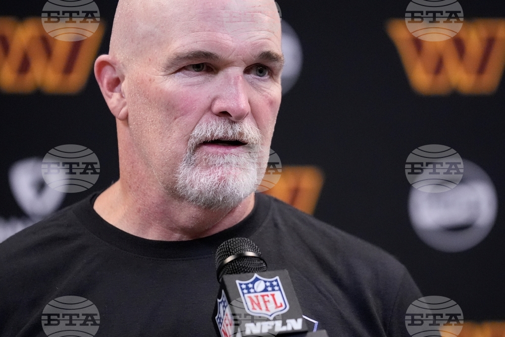 Washington Commanders head coach Dan Quinn speaks after an NFL football game between the Atlanta Braves and the Pittsburgh Pirates, Sunday, Sept. 28, 2025, in Atlanta. (AP Photo/Brynn Anderson)