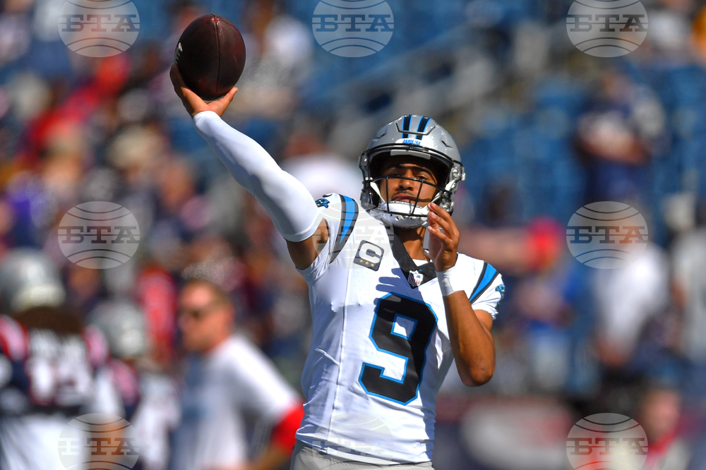 Carolina Panthers quarterback Bryce Young (9) warms up before an NFL football game against the New England Patriots, Sunday, Sept. 28, 2025, in Foxborough, Mass. (AP Photo/Steven Senne)