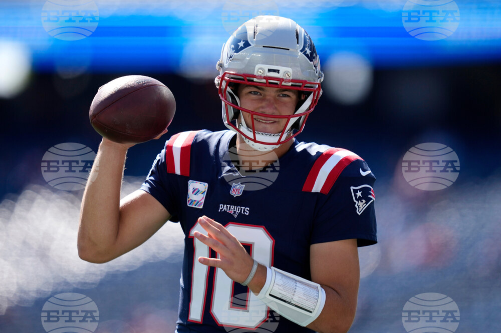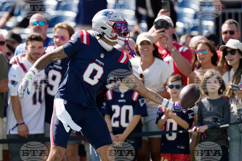 New England Patriots quarterback Drake Maye (10) warms up before an NFL football game against the Carolina Panthers, Sunday, Sept. 28, 2025, in Foxborough, Mass. (AP Photo/Charles Krupa)
