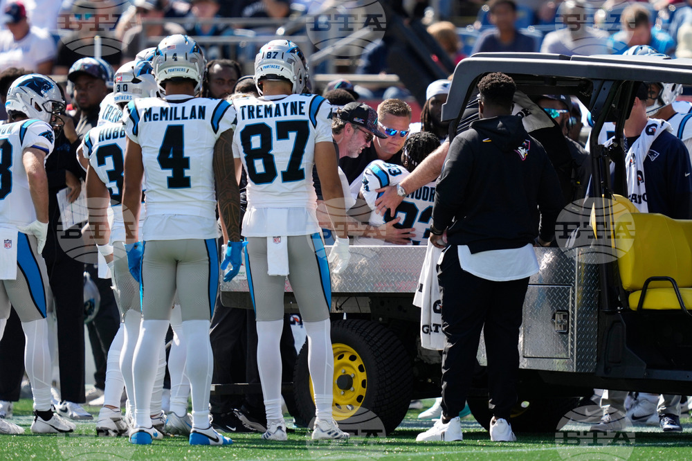 Carolina Panthers wide receiver David Moore (83) is carted off the field after an injury during the first half of an NFL football game against the New England Patriots, Sunday, Sept. 28, 2025, in Foxborough, Mass. (AP Photo/Charles Krupa)