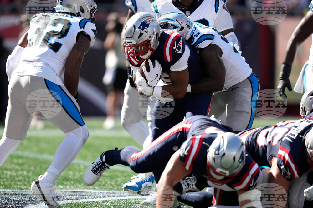 New England Patriots running back Antonio Gibson, center, scores a touchdown against Carolina Panthers defensive tackle Tershawn Wharton (99) during the first half of an NFL football game, Sunday, Sept. 28, 2025, in Foxborough, Mass. (AP Photo/Charles Krupa)