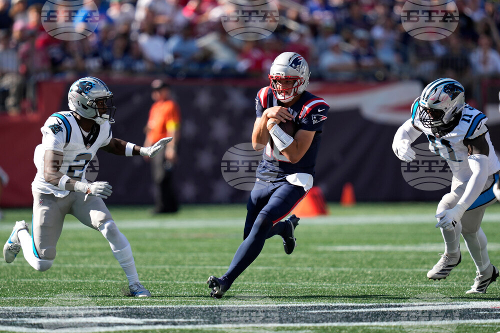 New England Patriots quarterback Drake Maye, center, runs against Carolina Panthers cornerback Mike Jackson (2) during the second half of an NFL football game, Sunday, Sept. 28, 2025, in Foxborough, Mass. (AP Photo/Charles Krupa)