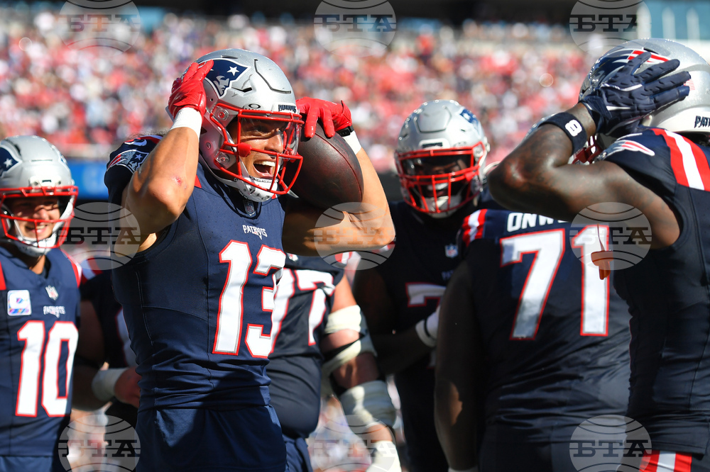 New England Patriots wide receiver Mack Hollins (13) celebrates with teammates after scoring a touchdown against the Carolina Panthers during the second half of an NFL football game, Sunday, Sept. 28, 2025, in Foxborough, Mass. (AP Photo/Charles Krupa)