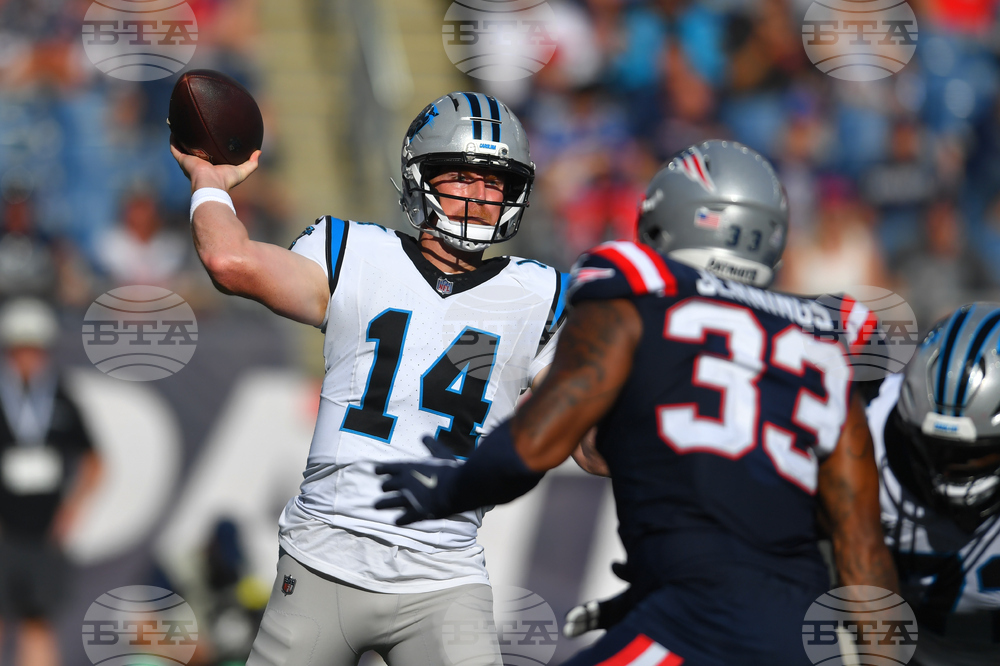 Carolina Panthers quarterback Bryce Young (9) throws a pass against the New England Patriots during the first half of an NFL football game, Sunday, Sept. 28, 2025, in Foxborough, Mass. (AP Photo/Steven Senne)