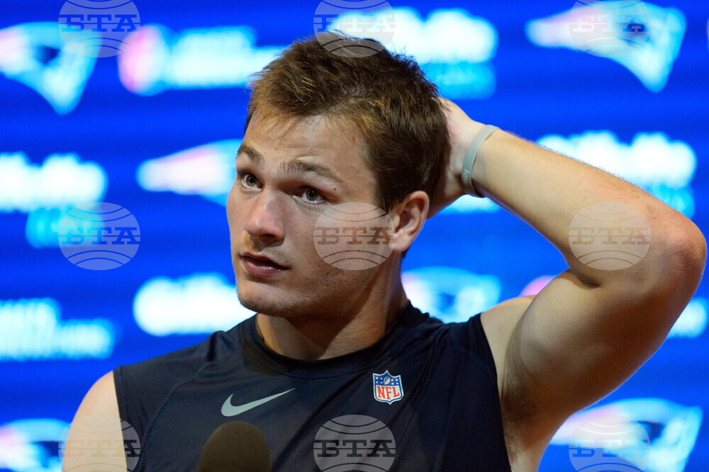 New England Patriots quarterback Drake Maye speaks during a news conference after his team defeated the Carolina Panthers in an NFL football game, Sunday, Sept. 28, 2025, in Foxborough, Mass. (AP Photo/Charles Krupa)
