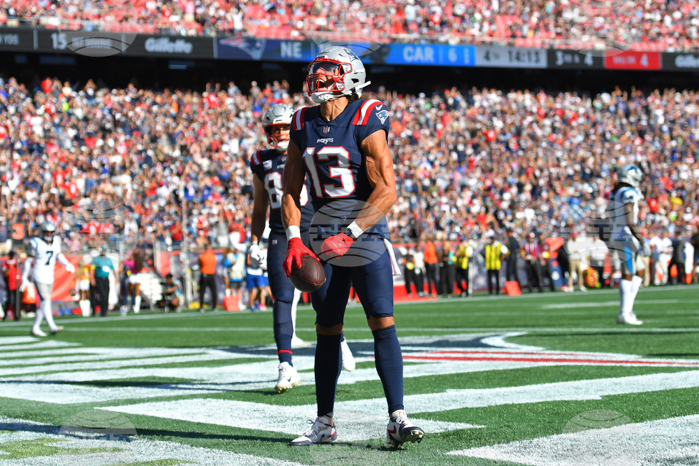 New England Patriots wide receiver Mack Hollins (13) celebrates after scoring a touchdown against the Carolina Panthers during the second half of an NFL football game, Sunday, Sept. 28, 2025, in Foxborough, Mass. (AP Photo/Charles Krupa)