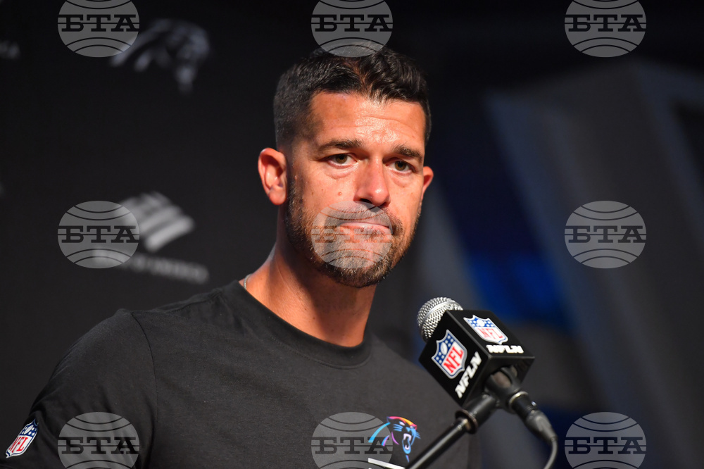 Carolina Panthers head coach Dave Canales speaks during a news conference after an NFL football game against the New England Patriots, Sunday, Sept. 28, 2025, in Foxborough, Mass. (AP Photo/Steven Senne)
