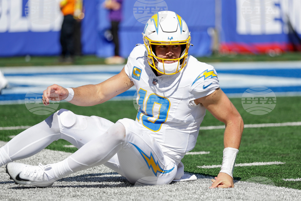 Los Angeles Chargers quarterback Justin Herbert (10) gets up off the turf after throwing an interception against the New York Giants during the first quarter of an NFL football game, Sunday, Sept. 28, 2025, in East Rutherford, N.J. (AP Photo/Adam Hunger)