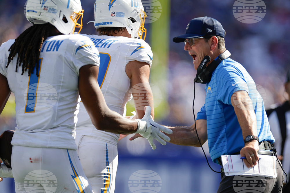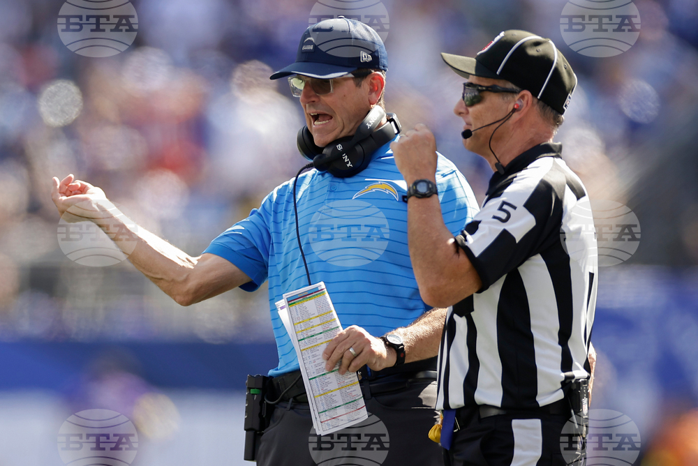 Los Angeles Chargers head coach Jim Harbaugh talks with side judge Jim Quirk (5) during the second quarter of an NFL football game, Sunday, Sept. 28, 2025, in East Rutherford, N.J. (AP Photo/Adam Hunger)