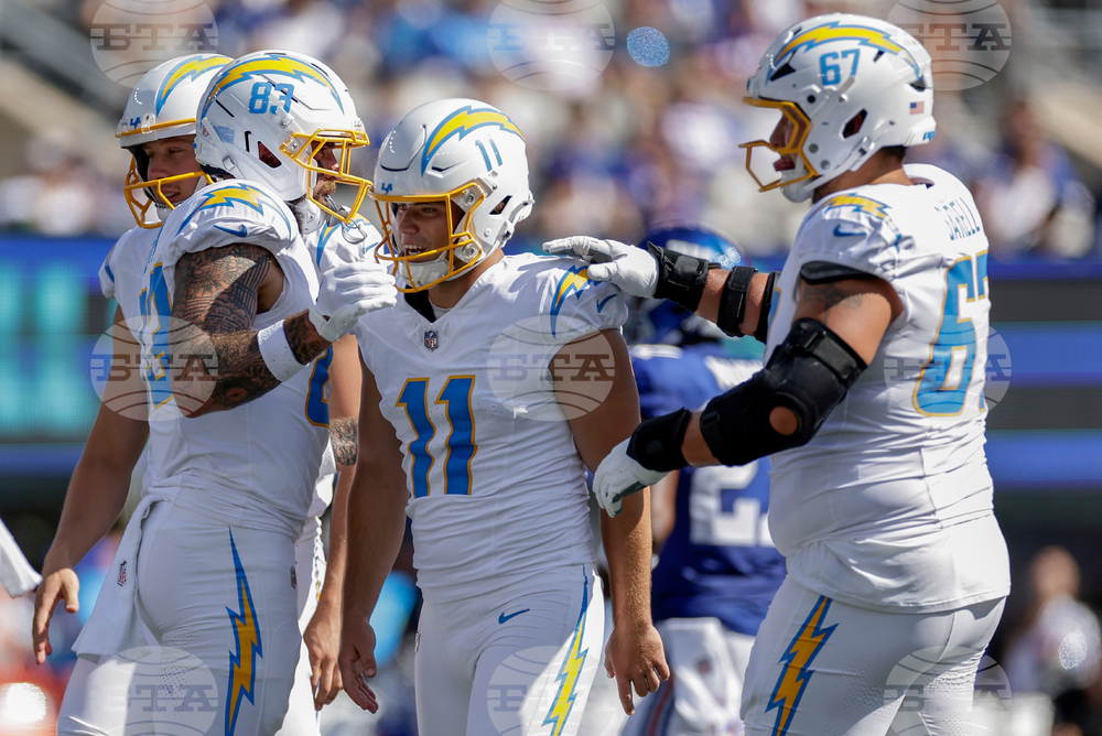 Los Angeles Chargers wide receiver Quentin Johnston (1) crosses the goal line for a touchdown against the New York Giants during the second quarter of an NFL football game, Sunday, Sept. 28, 2025, in East Rutherford, N.J. (AP Photo/Adam Hunger)