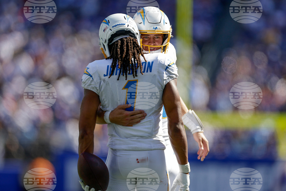Los Angeles Chargers quarterback Justin Herbert congratulates wide receiver Quentin Johnston (1) after Johnston scored a touchdown against the New York Giants during the second quarter of an NFL football game, Sunday, Sept. 28, 2025, in East Rutherford, N.J. (AP Photo/Adam Hunger)