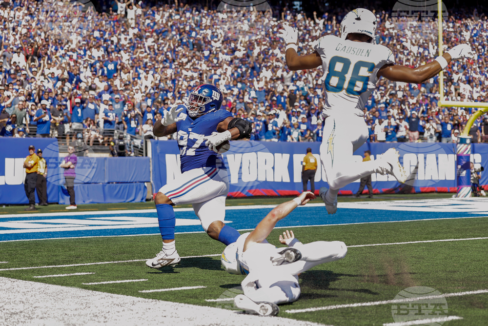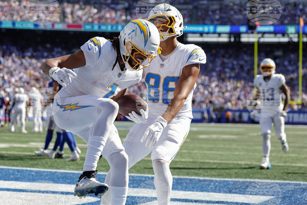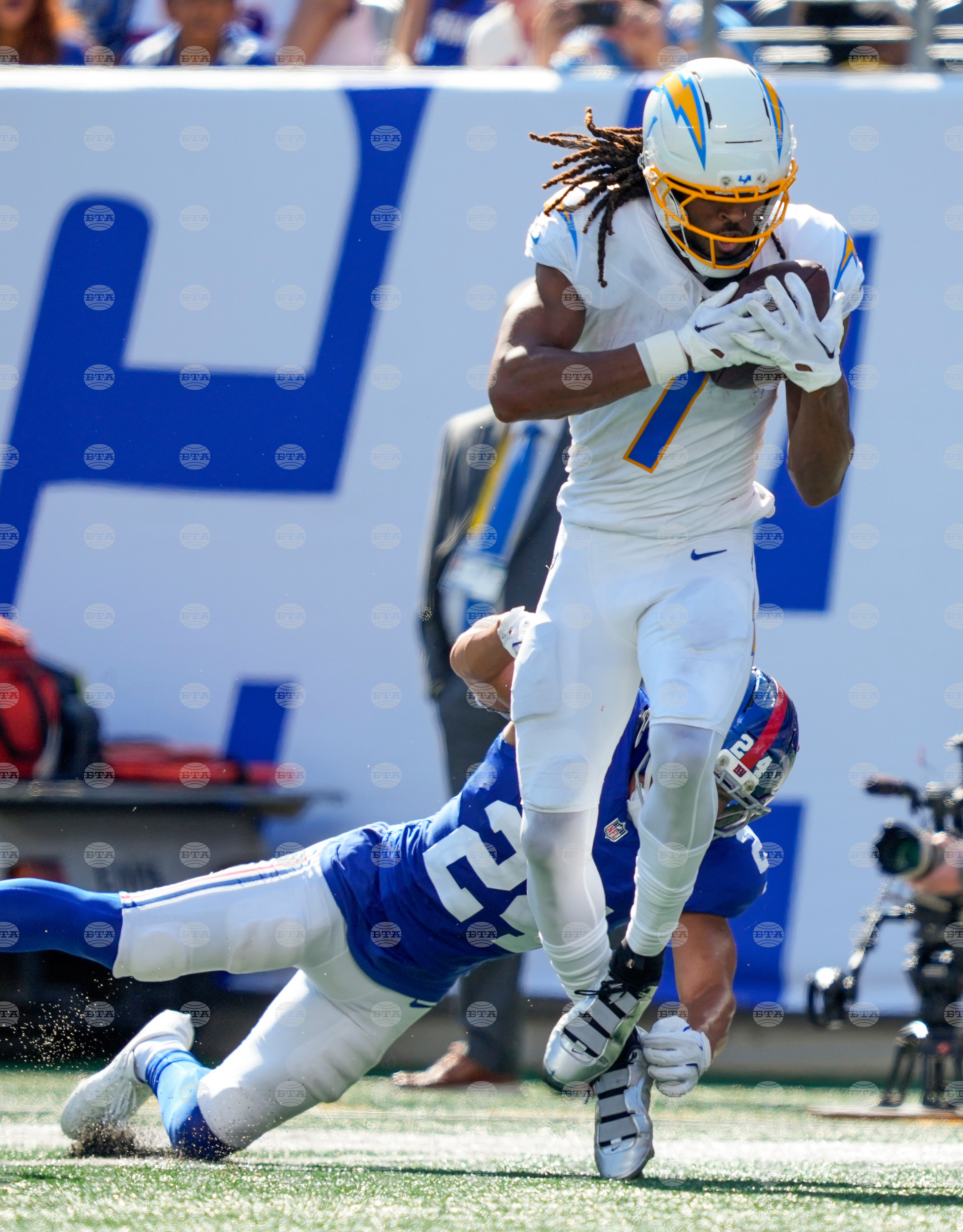 Los Angeles Chargers wide receiver Quentin Johnston (1) make a touchdown catch against New York Giants safety Dane Belton (24) and cornerback Deonte Banks (2) during the second quarter of an NFL football game, Sunday, Sept. 28, 2025, in East Rutherford, N.J. (AP Photo/Adam Hunger)
