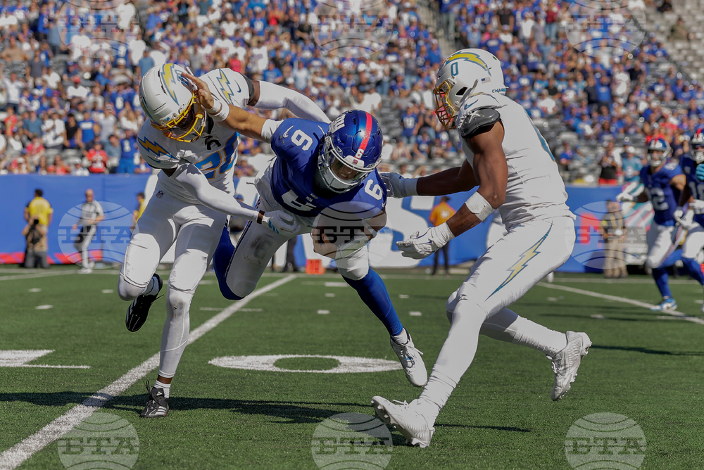 New York Giants running back Cam Skattebo (44) is upended by Los Angeles Chargers cornerback Cam Hart (20) during the second quarter of an NFL football game, Sunday, Sept. 28, 2025, in East Rutherford, N.J. (AP Photo/Yuki Iwamura)