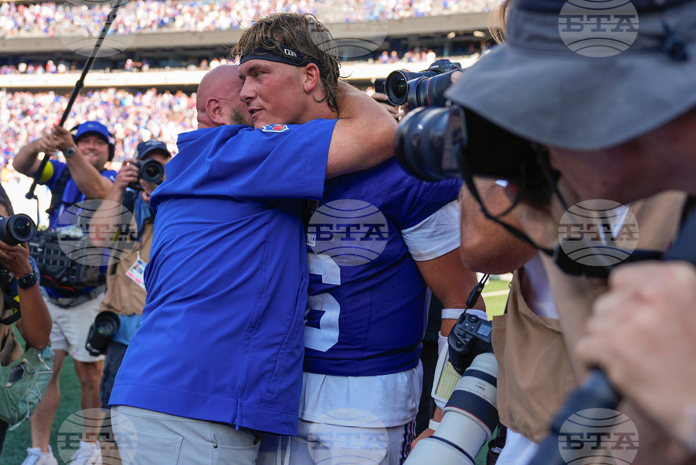 New York Giants quarterback Jaxson Dart (6) gets a hug from head coach Brian Daboll after the Giants defeated the Los Angeles Chargers in an NFL football game, Sunday, Sept. 28, 2025, in East Rutherford, N.J. (AP Photo/Yuki Iwamura)