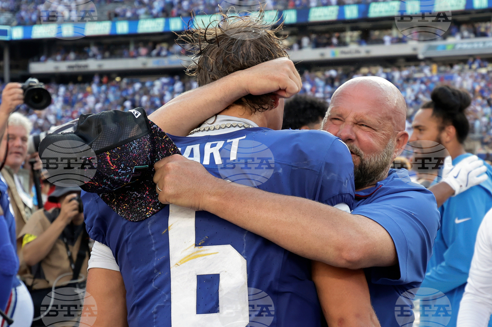 New York Giants head coach Brian Daboll, left, talks with quarterback Jaxson Dart (6) after defeating the Los Angeles Chargers in an NFL football game, Sunday, Sept. 28, 2025, in East Rutherford, N.J. (AP Photo/Yuki Iwamura)