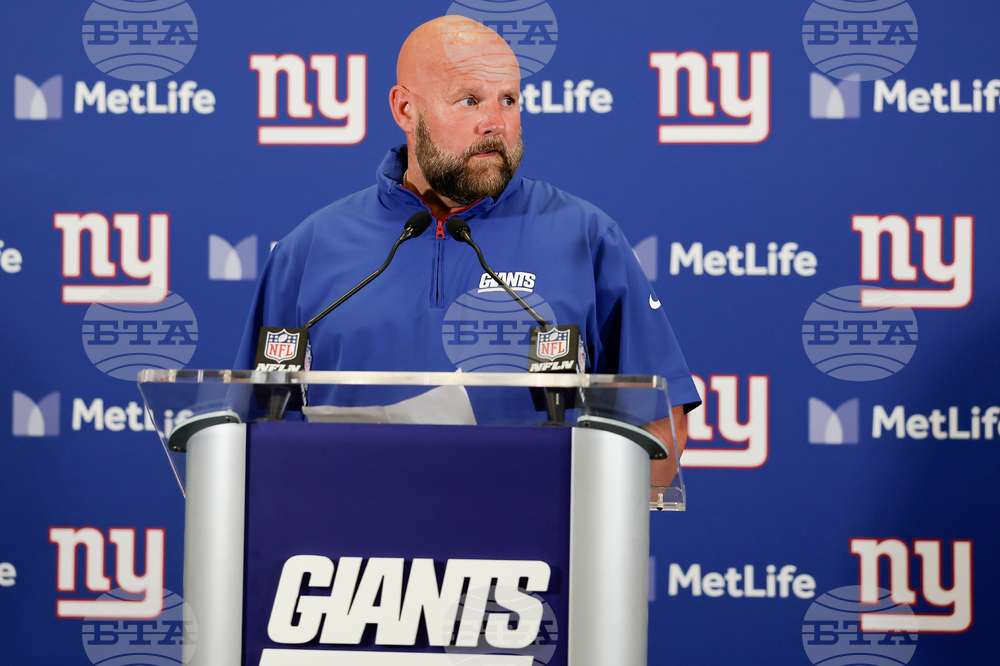 New York Giants head coach Brian Daboll answers questions during a news conference after an NFL football game against the Los Angeles Chargers, Sunday, Sept. 28, 2025, in East Rutherford, N.J. (AP Photo/Adam Hunger)