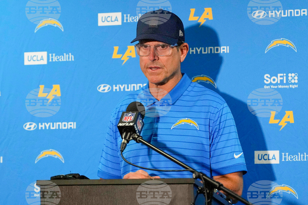 Los Angeles Chargers head coach Jim Harbaugh answers questions during a news conference after an NFL football game against the New York Giants, Sunday, Sept. 28, 2025, in East Rutherford, N.J. (AP Photo/Yuki Iwamura)