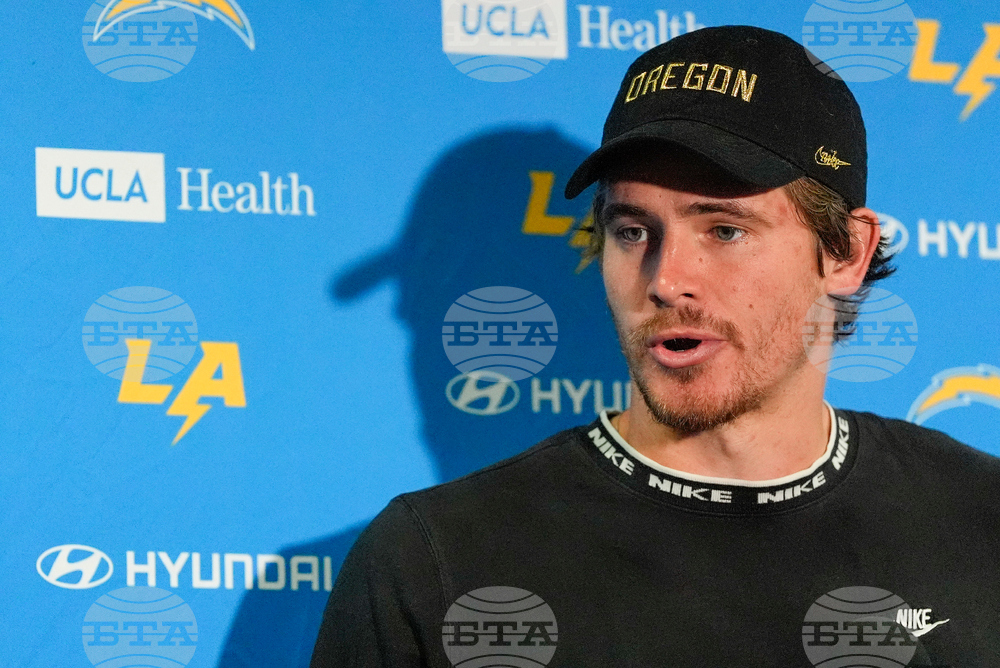 Los Angeles Chargers quarterback Justin Herbert answers questions during a news conference after playing against the New York Giants in an NFL football game, Sunday, Sept. 28, 2025, in East Rutherford, N.J. (AP Photo/Yuki Iwamura)