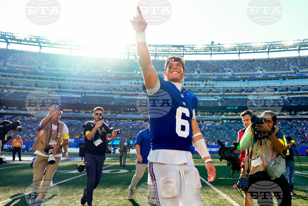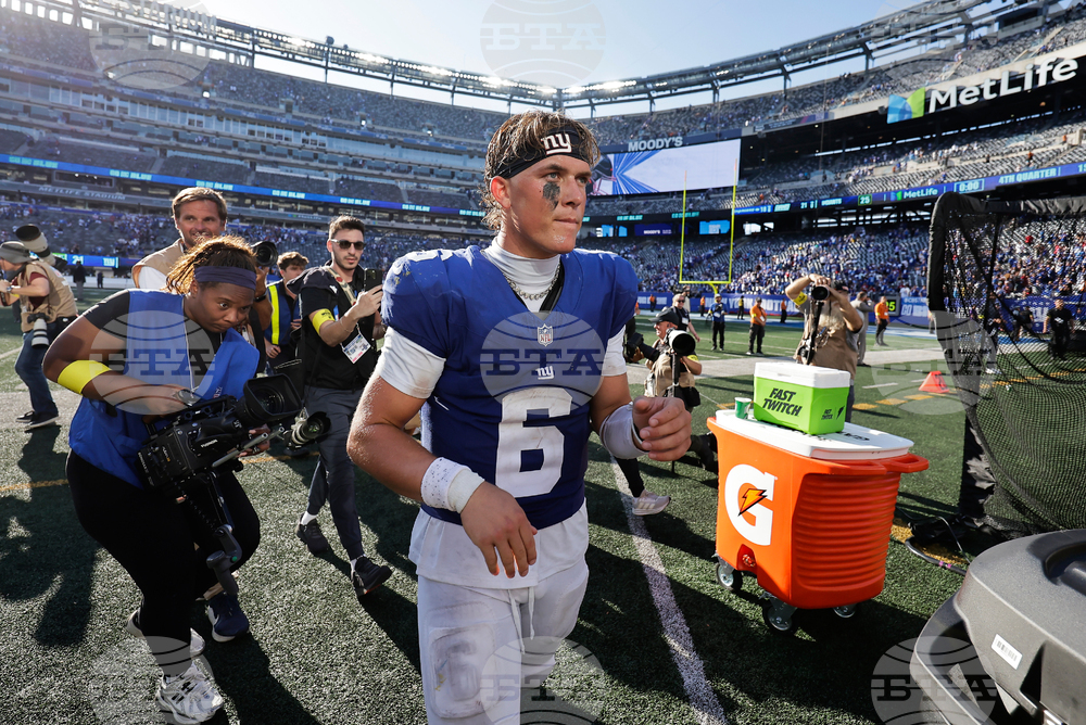 New York Giants quarterback Jaxson Dart (6) walks off the field after defeating the Los Angeles Chargers in an NFL football game, Sunday, Sept. 28, 2025, in East Rutherford, N.J. (AP Photo/Adam Hunger)