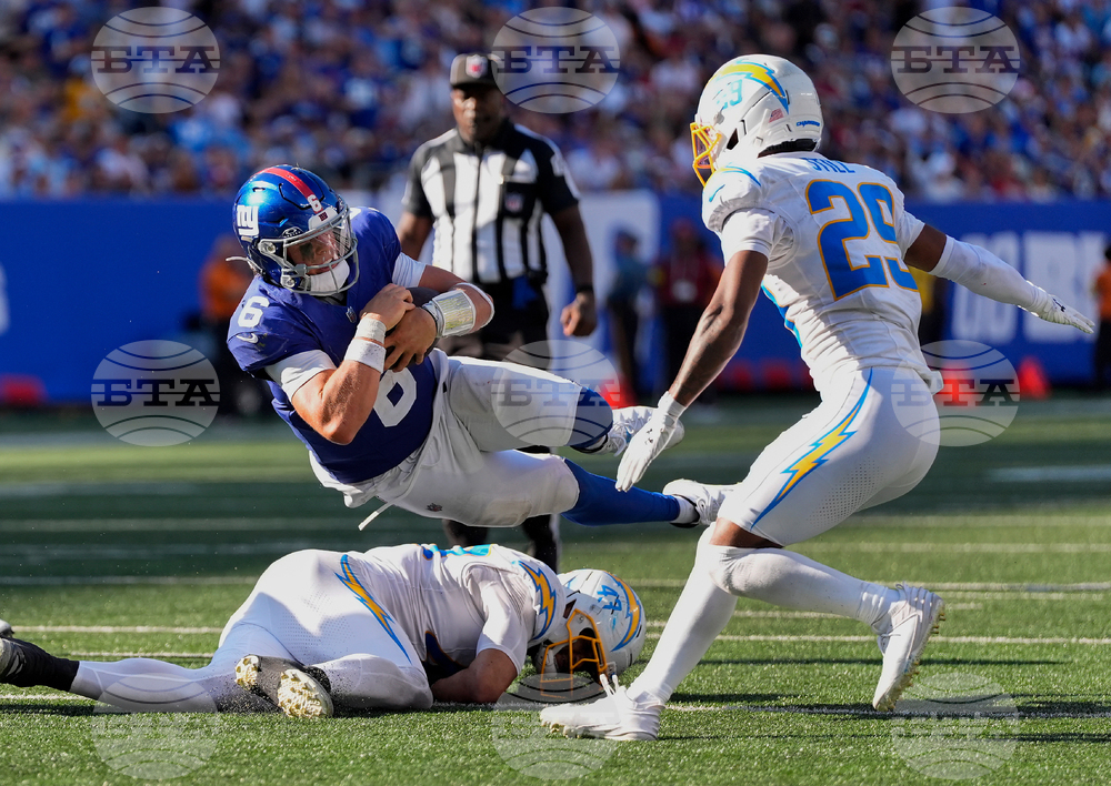 New York Giants linebacker Kayvon Thibodeaux (5) sacks Los Angeles Chargers quarterback Justin Herbert (10) during the first quarter of an NFL football game, Sunday, Sept. 28, 2025, in East Rutherford, N.J. (AP Photo/Adam Hunger)