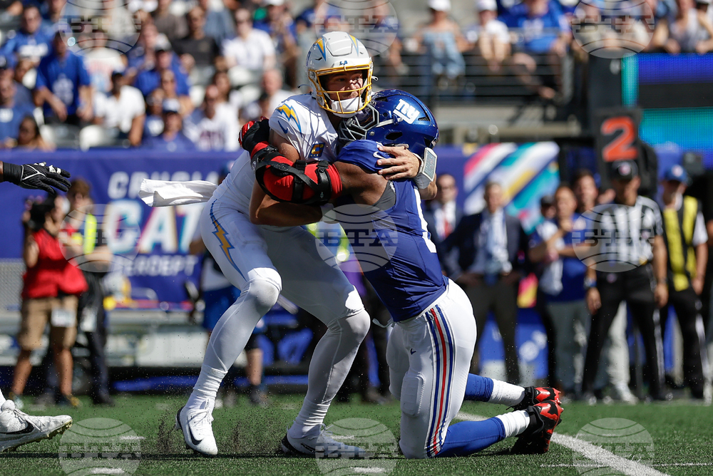 Los Angeles Chargers quarterback Justin Herbert (10) is sacked by the New York Giants during the fourth quarter of an NFL football game, Sunday, Sept. 28, 2025, in East Rutherford, N.J. (AP Photo/Yuki Iwamura)