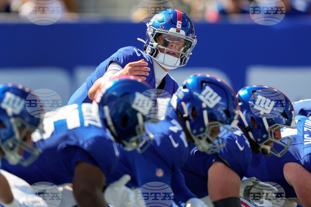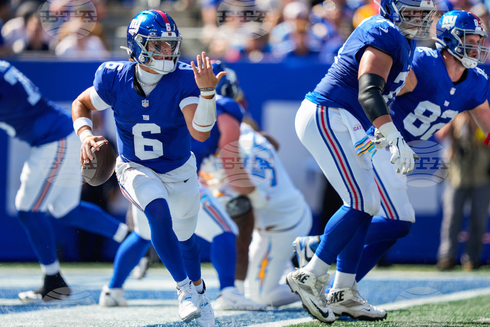 New York Giants quarterback Jaxson Dart (6) calls an audible at the line of scrimmage against the Los Angeles Chargers during the first quarter of an NFL football game, Sunday, Sept. 28, 2025, in East Rutherford, N.J. (AP Photo/Yuki Iwamura)