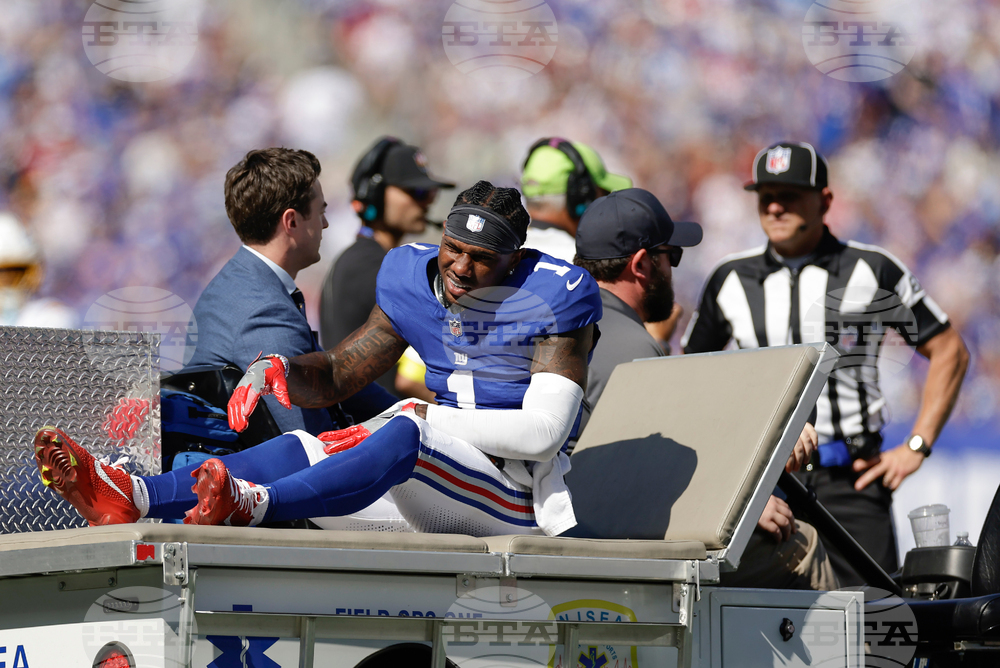 New York Giants wide receiver Malik Nabers (1) is driven off the field after an injury during the second quarter of an NFL football game against the Los Angeles Chargers, Sunday, Sept. 28, 2025, in East Rutherford, N.J. (AP Photo/Adam Hunger)