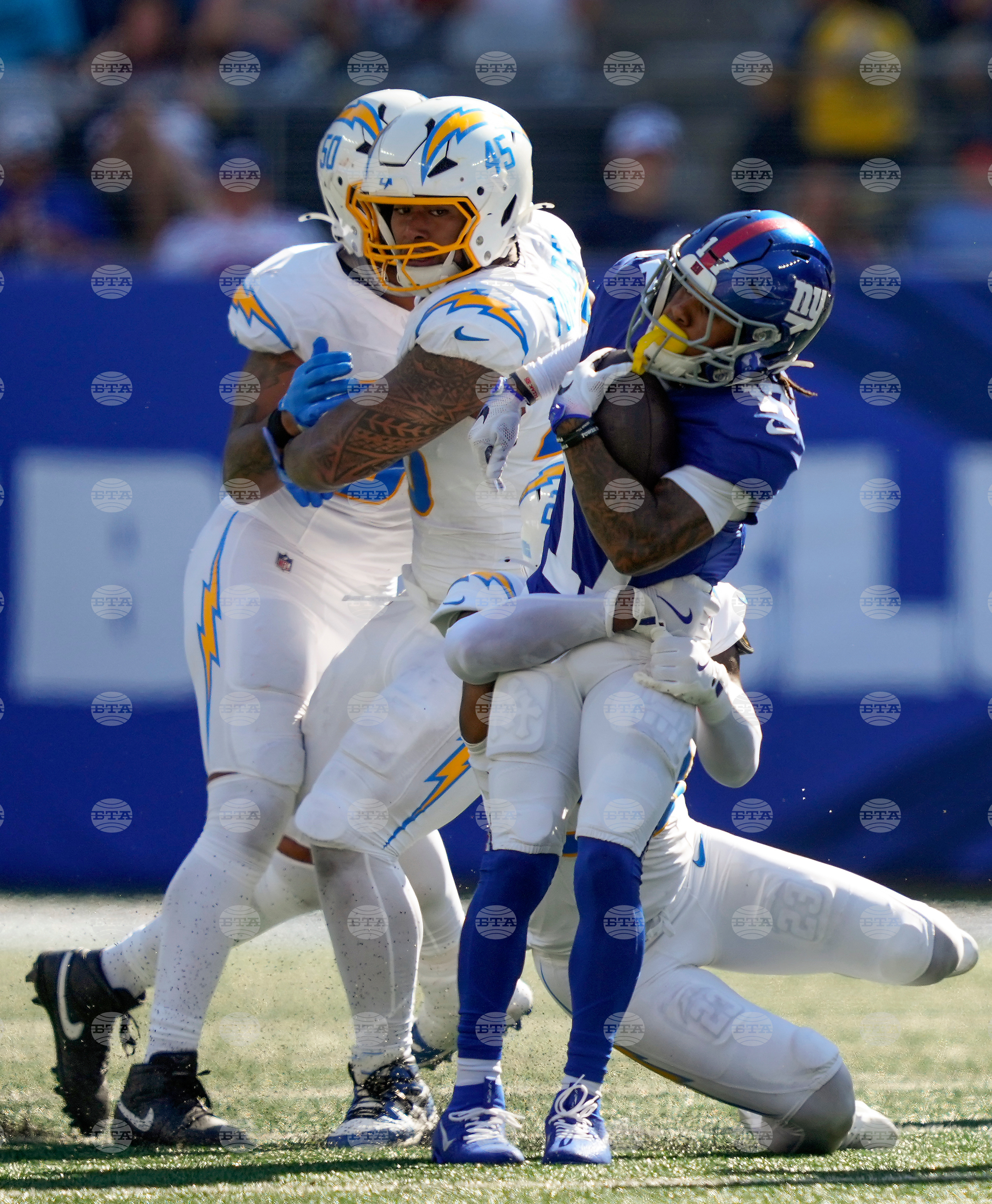 New York Giants wide receiver Wan'Dale Robinson (17) is tackled by the Los Angeles Chargers during the third quarter of an NFL football game, Sunday, Sept. 28, 2025, in East Rutherford, N.J. (AP Photo/Yuki Iwamura)