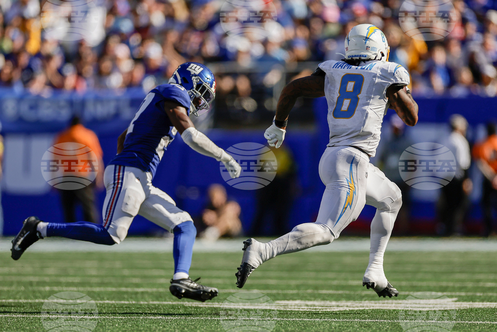 Los Angeles Chargers running back Omarion Hampton (8) carries the ball against New York Giants safety Dane Belton (24) during the second quarter of an NFL football game, Sunday, Sept. 28, 2025, in East Rutherford, N.J. (AP Photo/Adam Hunger)
