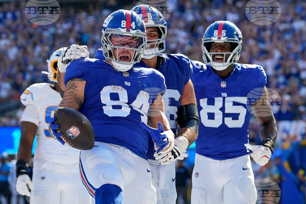New York Giants tight end Theo Johnson (84) celebrates after scoring a touchdown against the Los Angeles Chargers during the third quarter of an NFL football game, Sunday, Sept. 28, 2025, in East Rutherford, N.J. (AP Photo/Yuki Iwamura)