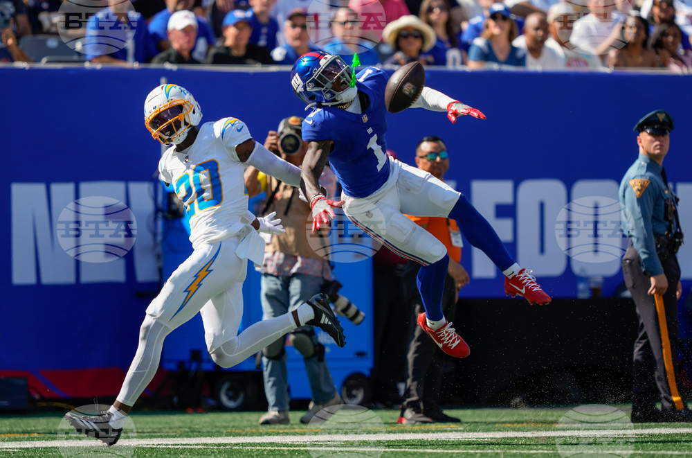 New York Giants wide receiver Malik Nabers (1) leaps for a pass against Los Angeles Chargers cornerback Cam Hart (20) during the second quarter of an NFL football game, Sunday, Sept. 28, 2025, in East Rutherford, N.J. (AP Photo/Yuki Iwamura)