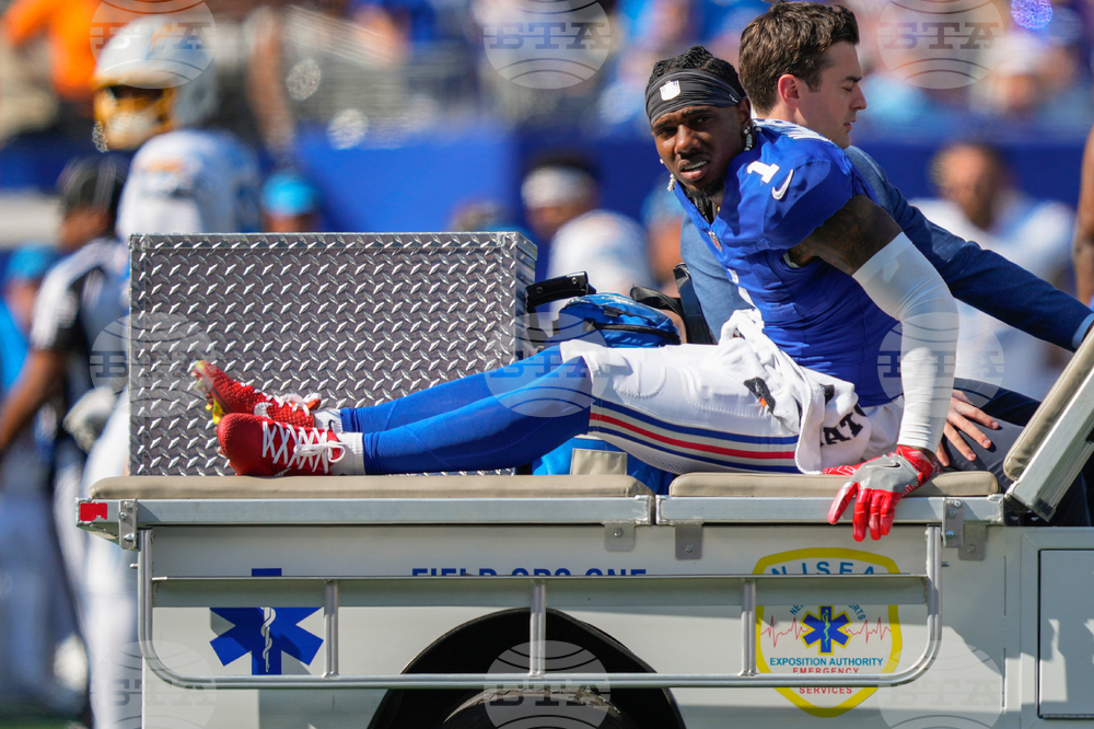 New York Giants wide receiver Malik Nabers (1) is driven off the field by medical personnel after an injury during the second quarter of an NFL football game against the Los Angeles Chargers, Sunday, Sept. 28, 2025, in East Rutherford, N.J. (AP Photo/Yuki Iwamura)